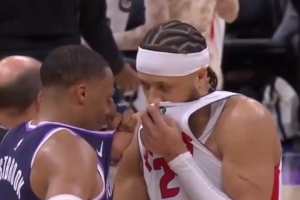 GIF-威少赛后和康宁汉姆寒暄许久 还用衣服挡住嘴