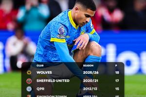 此外,狼队在18轮可争取的54个积分中只拿到2分,也是英超历史新低。联赛不到半程,他们已经落后安全区16分。
