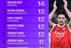 Squawka数据统计本赛季至今各项赛事中,德克兰-赖斯是创造绝佳机会次数最多的英超球员,共14次。