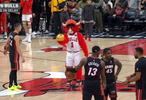 等待期间,热火球员希罗与公牛吉祥物进行半场背投比赛,结果公牛吉祥物一击命中,希罗见状宣布直接退出较量。
