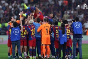 体育资讯1月12日讯 西超杯决赛,巴萨3-2战胜皇马。据The Athletic报道,阿劳霍在赛后被队友抛起庆祝。